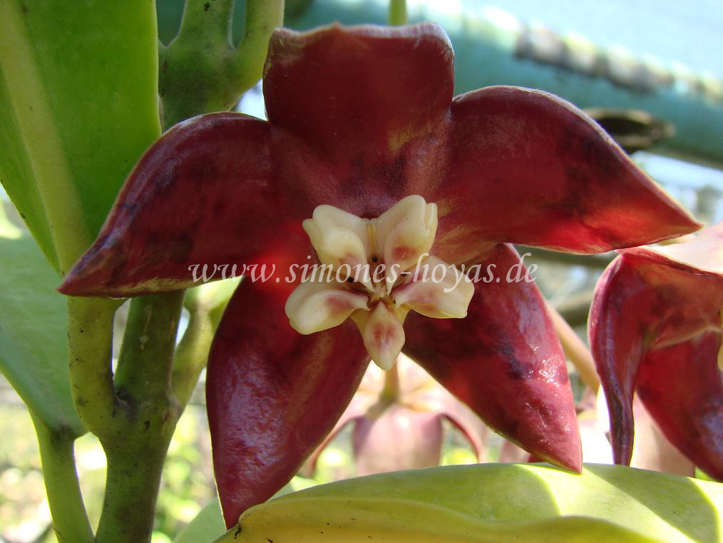 Hoya imperialis Lindley 1846 H. imperialis blühend in Sabah, Borneo im Sommer 2006 In Sukkulenten (1892), S. 16, einer deutschsprachigen Publikation beschreiben Rumpler & Schumann Hoya imperialis Lindl. als ….. „Kaiserliche Wachsblume. Die langen verästelten, stielrunden Triebe sind in der Jugend filzig. Die Blätter werden über spannenlang, sie sind oblong-lanzettlich, kurz zugespitzt, fleischig und kurz gestielt. Die lang gestielte, lockere, hängende Dolde besteht aus 8-10 Blüten, deren Blumenkrone dunkelbraun ist, während die wachsartige Corona weisz ist……“ In Gartenflora (1855), S. 282, einer weiteren deutschsprachigen Publikation wird Hoya imperialis Lindl. var. rauschii wie folgt beschrieben: ………. „Die prächtige Hoya imperialis mit ihren mächtigen braunen Blumendolden blühet gegenwärtig unter der sorgsamen Pflege des Hrn. Kraft, Gärtner bein Hrn. Rausch in Schaffhausen, in 2 verschiedenen Formen. Von diesen ist die erstere, die echte Hoya imperialis, wie sie das Botanical Magazine und nach diesem alle andern Journale abgebildet. Die Blumenkrone ist hier braunpurpur, mit breit oval nadelförmigen Lappen, die so lang als breit sind….Die zweite Varietät erhielt Herr Rausch von Mackoy in Lüttich, als Hoya imperialis. Sie hat eine lackroth gefärbte viel hellere Blumenkrone, deren Lappen lanzettlich-deltaförmig, also länger als breit sind. Da Herr Rausch uns die Freiheit gab, sie nach ihm zu nennen…….. Gehört als Schlingpflanze zu den schönsten Zierden des Orchideenhauses…“ H. imperialis ist in Malaysia und auf der Insel Borneo beheimatet. Es ist eine spektakuläre Hoya mit großen, ovalen, bei einigen Klonen leicht gewellten und stark sukkulenten Blättern, von 12-15 cm Länge und 6-8 cm Breite. Die Mittelvene ist deutlich sichtbar. Die Blätter sind leicht behaart. Hat die Pflanze einen guten Standort, wächst sie schnell zu einer großen Zimmerpflanze heran. Der Standort sollte sonnig sein, aber die pralle Mittagssonne muss vermieden werden, sonst verbrennen die Blätter. Die Triebe müssen ab und zu geschnitten werden, damit H. imperialis sich verzweigt. Die Mindesttemperatur am Standplatz sollte nicht unter 20°C abfallen. H. imperialis im Taman Pertanian Sabah, Borneo im August 2006 Die Blüten einer H. imperialis sind sehr eindrucksvoll und zählen in der Gattung Hoya zu den größten. 8 cm große rosarote Blüten blühen in lockeren hängenden Dolden. Bis zu 10 Einzelblüten kann eine Traube haben. Ab einem Alter von etwa 2 Jahren blüht eine H. imperialis problemlos. Die Blüten halten etwa zwei Wochen. Sie scheiden viel klebrigen Nektar aus. Die Blüten duften frisch, ähnlich Gardenien. Der Duft ist in den Abend- und Morgenstunden besonders zu spüren. Gegossen wird sparsam. Die Luftfeuchtigkeit sollte durch Sprühen in der Hauptwachstumszeit hoch gehalten werden. Gedüngt wird ebenfalls sparsam. Die Pflanze braucht ab einer bestimmten Größe unbedingt ein Rankgitter. Sie sollte warm stehen. Vorsicht mit Verletzungen der Pflanze. Wird ein Blatt oder Trieb abgebrochen, tritt sehr viel Milchsaft aus, der an der Pflanze herunter läuft, und auf Fußböden oder Möbeln unschöne Flecken hinterlässt. Dem Substrat sollte etwas Kalk hinzugefügt werden. H. imperialis in Thailand im August 2007 Von H. imperialis gibt es einige Variationen. H. imperialis var. alba Die Blüten sind weiß mit zartgrünen Farbnuancen. Sie wurde in Palawan und auf den Philippinen gefunden. T. Green fand eine Pflanze im Oktober 1993 auf einem Sammeltrip mit D. Cumming und seiner Frau Odette. 42 km nördlich der Hauptstadt Puerto Princesa der Insel Palawan fanden sie die seltene weiß blühende species in einem Mangrovenwald.H. imperialis var. Palawan Die Blüten sind goldgelb mit einem leichten Rot. Die Heimat ist Palawan.H. imperialis Borneo Red hat pink farbene Blüten. Sie wächst gut. Bildet sie Knospen, benötigen diese fast zwei Monate, bevor sie erblühen. Der Duft ist fruchtig süß. H. imperialis var. Palawan Foto: Andy Röhrig H. imperialis var. rauschii wird auch als H. imperialis gigantea verkauft. Sie hat immer gewellte Blattränder. Die Blätter sind größer wie bei den anderen Klonen. Die Blüten sind sehr variabel. Die Farbe ist ein grünliches Weiß mit rosa oder Schattierungen von purpurrot. Der Klon blüht schwer.H. imperialis ‚Mosaik‚ ist kein eingetragener cv. Name. Er bezeichnet einen Klon mit weißen Flecken in den pink farbenen Blüten und auf den Blättern. Dieser Klon stammt aus einer Sämlingsauslese von Michael Miyashiro aus dem Jahre 1990. Die amerikanische Hoyaspezialistin C. M. Burton führt diese Färbungen auf eine Virusinfektion zurück, die alle Teile der Pflanze beeinflusst. Sie benennt diesen Klon als Auslese von H. imperialis Borneo Red. H. imperialis 2005 Herbarmaterial NameBlattnummerTypstatusSammlerFundortFunddatumHerbarium Hoya imperialis Lindley# 1230LindleyNordborneoUS Hoya imperialis Lindley# 20629HolotypLindleyNordborneoGH Hoya imperialis Lindley# ohne NummerBO Hoya imperialis Lindley#BO Hoya imperialis Lindley#NordborneoBO Hoya imperialis Lindley#BO Hoya imperialis Lindley#MalaysiaSING Hoya imperialis Lindley# 1135MaingayMalaysia, MalaccaL, K, D Hoya imperialis Lindley# ohne NummerDouxMersing1934SING Hoya imperialis Lindley# 15530Senebal1929SING Hoya imperialis Lindley# ohne NummerHandoverPort Dixon 1924SING Hoya imperialis Lindley# 1170EbenarBorneo.Pasin Pandjang1964L Hoya imperialis Lindley# 21314KostermansBern , Mt. Njapa 1964BO Hoya imperialis Lindley# 27640ClemensMt. Kinabalu1931BO Hoya imperialis Lindley# 20629ElmerTawao1923BO Hoya imperialis Lindley# 15743LorzingSumatra, Belaswan River 1929BO, L Hoya imperialis Lindley# 1230RamosPhilippines 1930 Hoya imperialis Lindley# 4001BaccariBorneo Hoya imperialis Lindley# 1041MotleyBorneo Hoya imperialis Lindley# 20629MotleyNear Tawao Publikationen Zeichnung aus Transactions of the Royal Horticulture Society, Vol. 5, S. 50 (1850) Zeichnung aus „Gartenflora (18