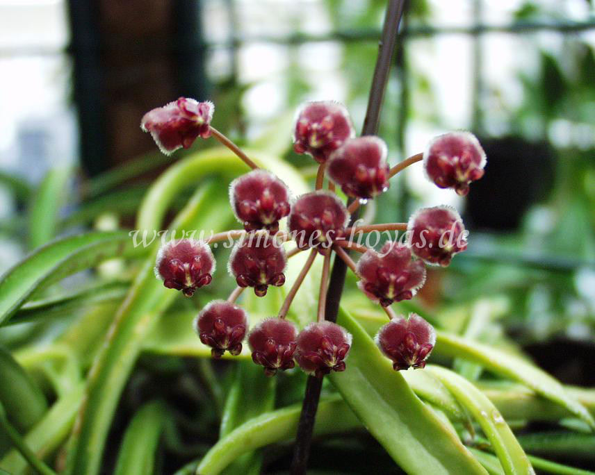 Hoya kentiana C. M. Burton 1991 meine Pflanze mit reichlich Blüten, 2004 H. kentiana ist im südöstlichen Asien, den Philippinen, Indien und Burma beheimatet. Am schönsten sieht sie als Hängepflanze aus.Auf dem dänischen Markt wurde sie unter dem falschen Namen H. angustifolia, syn. H. pottsii verkauft. Ein weiterer Verkaufsname ist China Bean(s), der auch für H. wayetii in deutschen Blumenmärkten zu lesen ist. Auch als H. laxiflora wird sie angeboten. H. kentiana wird von vielen Hoyasammlern in Synonymität zu H. wayetii Kloppenburg gestellt. Es handelt sich aber um zwei Hoyaarten, die sich tatsächlich sehr ähnlich sind. Nach C. M. Burton ist H. wayetii ein Klon von H. kentiana. Die Blätter der H. kentiana sind länglich spitz, immer kleiner und schmaler als die Blätter von H. wayetii. Sie sind 11 cm lang und 1,5 cm breit, deutlich im Grün etwas heller. Neues Blattwachstum sieht rötlich aus. Der charakteristische rote bis dunkelbraune, bei älteren Blättern fast schwarze Blattrand der H. wayetii ist nicht vorhanden. Auch die Blüte von H. kentiana ist kaum von H. wayetii zu unterscheiden. H. kentiana blüht fast das ganze Jahr in Massen kleiner Dolden purpurroter Blüten. H. aff. kentiana Blüten sind in Form und Größe vollkommen gleich, allerdings mit einem hellen gelben Zentrum. H. wayetii Dolden sind immer dunkler, etwas größer, in der Blütenfarbe lila mit dunkel violetter Nebenkrone oder mit zart gelber Mitte. Die Blütenlappen sind bei beiden Arten zusammen gewachsen und stark nach hinten gebogen. Nach dem Verblühen sollten die Blütenstängel nicht ab geschnitten werden, da die Pflanzen immer wieder aus ihnen blühen. Die Blüten der H. kentiana halten etwa 3 Tage und verströmen keinen Duft. H. kentiana wird in die Sektion Otostemma eingeordnet. H. kentiana 2006 Herbarmaterial NameBlattnummerTypstatusSammlerFundortFunddatumHerbarium H. intermedia Schlechter = Hoya kentiana C. M. Burton# 28531HolotypRamos & EdanoPhilippinen, Insel Luzon, Quezon am Mt. Binuang in der Provinz von TayabasMai 1917US Publikationen The Hoyan 12 (3) IV (1991) Klassifizierung C. M. Burton Hoya kentiana -Blüten